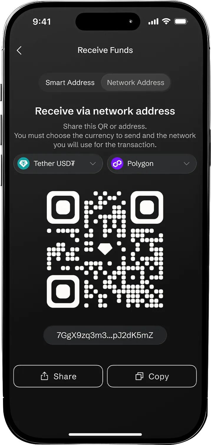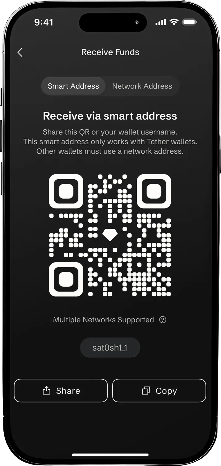 Tap 'Receive', choose the currency, and share your username or QR to get paid in seconds.